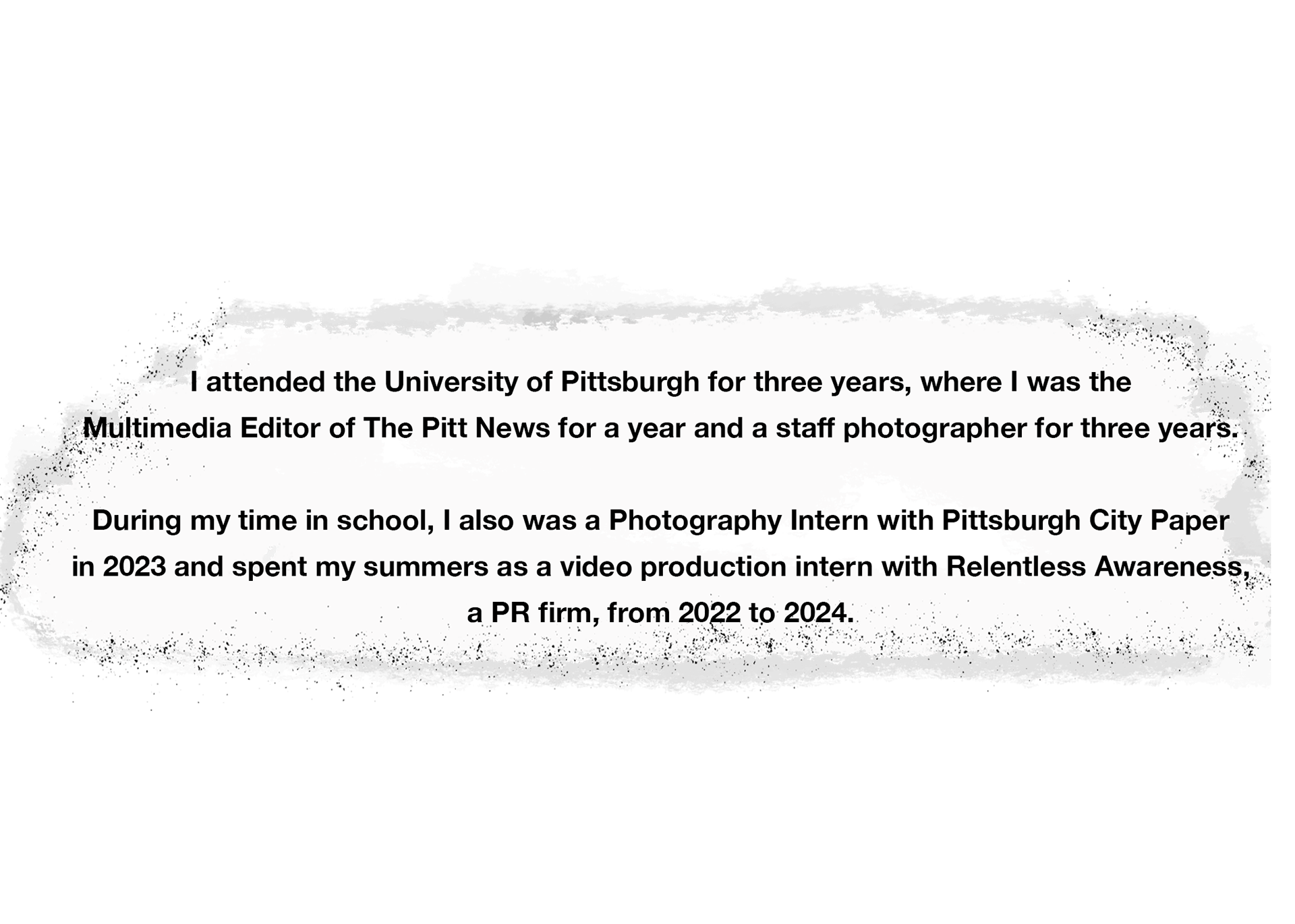 I attended the University of Pittsburgh for three years, where I was the Multimedia Editor of The Pitt News for a year and a staff photographer for three years. During my time in school, I also was a Photography Intern with Pittsburgh City Paper in 2023 and spent my summers as a video production intern with Relentless Awareness, a PR firm, from 2022 to 2024.
